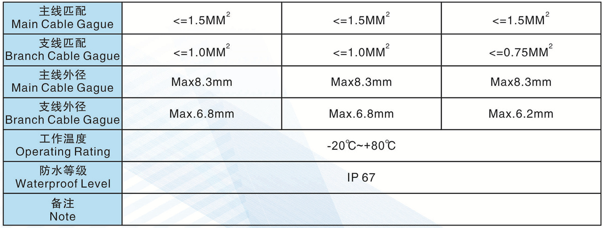 支線匹配(Branch Cable Gague): <= 1.0MM2 <=1.0MM2 <=0.75MM2